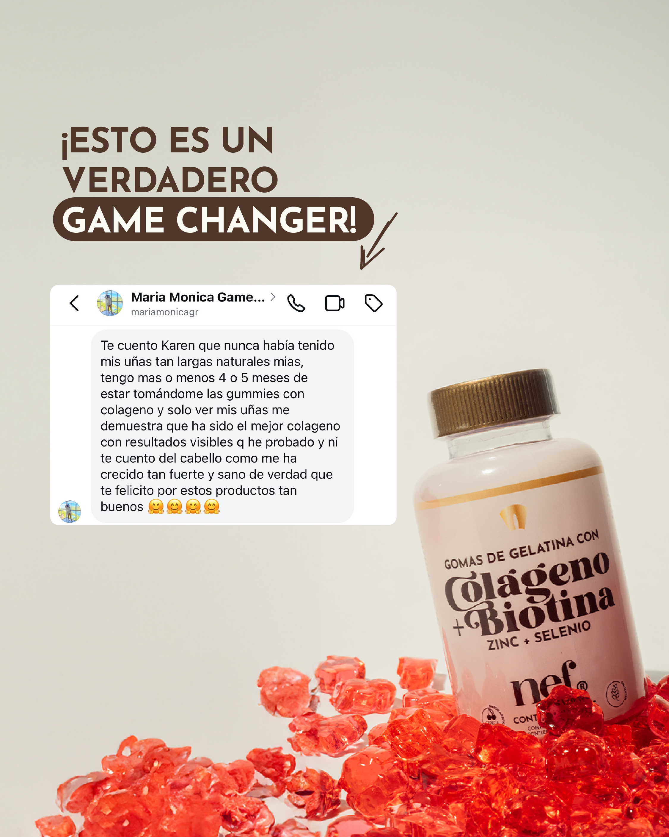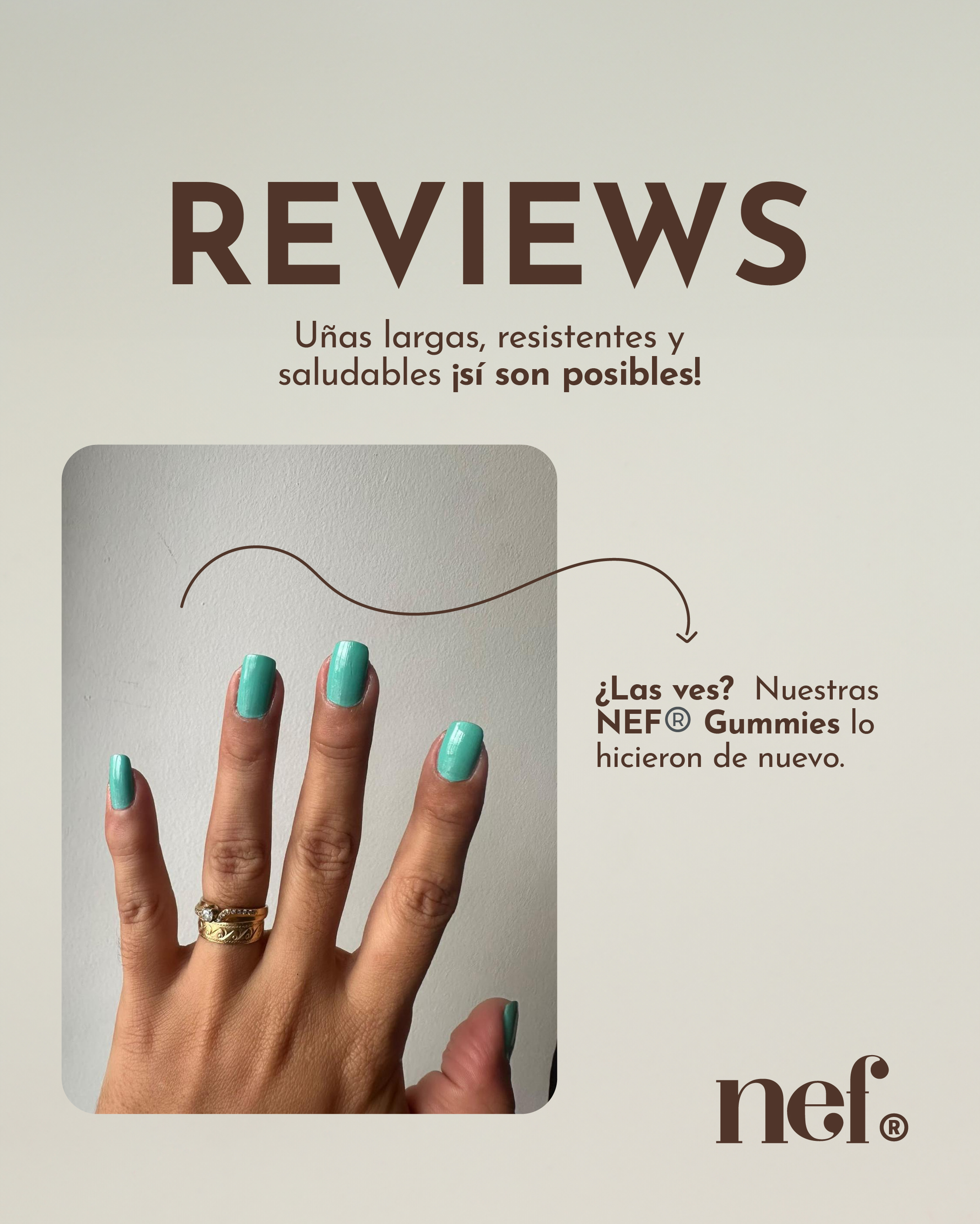Cuidarse nunca fue tan fácil. Con nuestras NEF® Gummies, tendrás un verdadero glow up! Con una combinación única de colágeno, biotina, zinc y selenio, nuestras gomitas no solo son una delicia para tu paladar, sino una explosión de beneficios para tu cabello, uñas y piel.